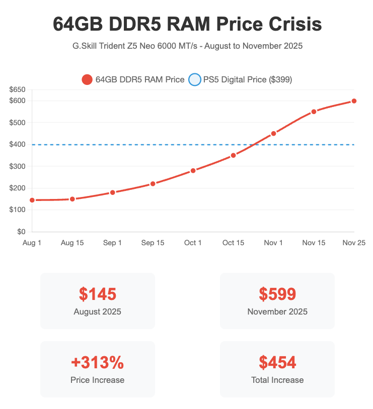 Just to give you a comparison, a 64GB RAM kit now costs more than an entire PlayStation 5 Digital Edition ($399) or Xbox Series S ($399).